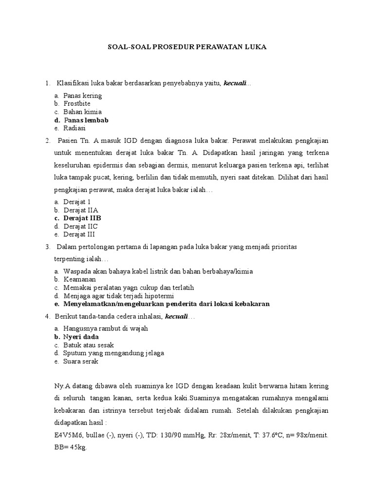 Soal Soal Perawatan Luka Ok from imgv2-2-f.scribdassets.com Mencegah anemia untuk meningkatkan kesehatan ibu. Silahkan klik pada judul artikel berikut untuk mendapatkan penjelasan lengkap seputar soal pilihan ganda stress dan adaptasi yang anda perlukan. Melakukan perawatan payudara unutk mencegah putting susu masuk ke dalam. Jelaskan apa yang dimaksud dengan cedera ! A) aman b) efektif biaya c) manusiawi d) memberikan harapan yang sama tentang apa yang baik bagi perawat dan. Pada soal diatas, kemungkinan jawaban d bisa juga dengan alasan melakukan tindakan perawat. Membalut kembali luka dengan rapi. Latihan soal ukom ners perawat perawat meninjau hasil agd klien yg dirawat dan mencatat dokumentasi laboratorium menunjukkan ph 7,30, pco2 58 mm hg, po2 80 mm hg dan hco3 27 meq/l.